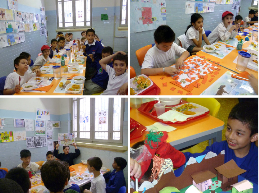 Arricchiamo così la nostra raccolta di osservazioni sul grande argomento del mangiare e ci costruiamo collettivamente una mappa generatrice da cui noi insegnanti progetteremo le successive attività. Grazie all’atteso imprevisto di uno sciopero della Milano Ristorazione, poi, la classe prepara un picnic in classe con decorazioni sulle tavole formate da quattro banchi, in un setting e in un clima ben diverso dal confusionario sotterraneo con le inferriate in cui solitamente pranziamo.