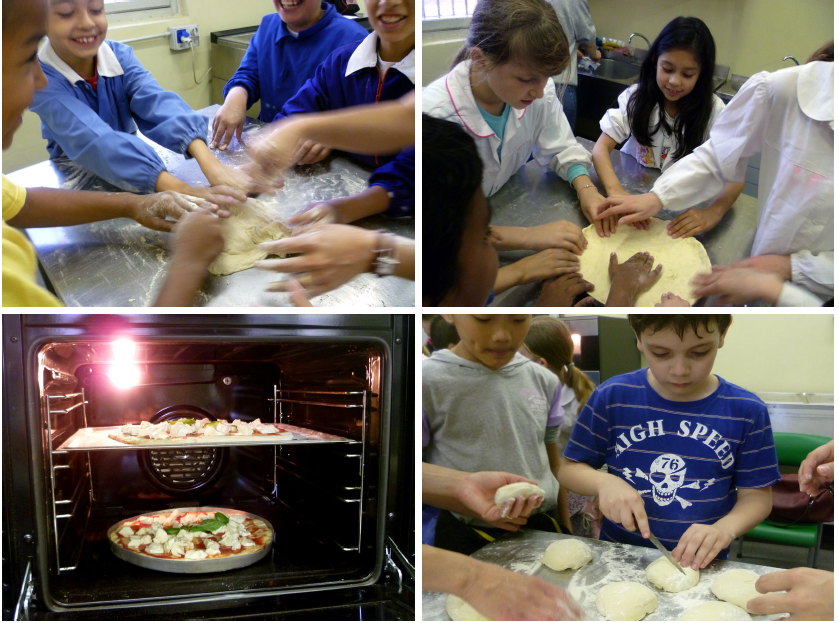 Si riparte dal cibo: persino la pizza a scuola non piace e allora cuciniamola noi, insieme, nelle cucine della scuola e facciamoci merenda su grandi teli nel prato del giardino, all’ombra degli alberi in fiore.